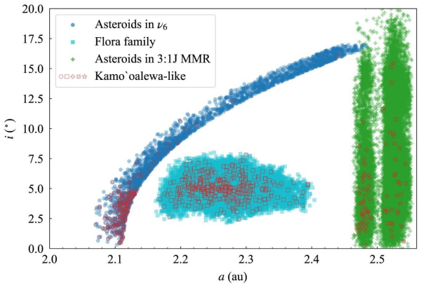模拟结果显示,三个候选源区均有相当比例的测试粒子,能够在长期演化后进入类似2016HO3的轨道。来自ν6共振区的粒子在长期共振作用下增大偏心率、减小近日点距离,从而进入近地空间;来自花神星族的粒子先缓慢漂移至ν6共振区,随后经历与该区粒子类似的轨道演化过程;位于木星3:1共振区的粒子,则可能在共振作用及与类地行星的密近交会影响下进入与2016HO3相似的轨道。