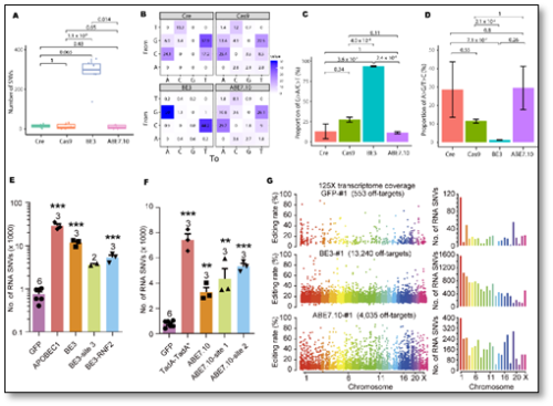 进一步研究将脱靶检测范围扩大至RNA水平,首次证明常用的三种单碱基编辑技术均存在大量的RNA脱靶。对其进行突变优化后,研究人员最终获得了能够完全消除RNA脱靶的高精度单碱基编辑工具。